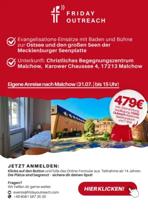 Wir sind bewegt, was Jesus am Kreuz für uns tat. Dieser Freitag wurde zum wichtigsten Tag für die gesamte Menschheit. Als er am Keuz hing, rief er aus: „Es ist vollbracht!“. Dies wurde zur Rettung für jeden, der diese Nachricht hört und glaubt. Darum wollen wir jeden Freitag zum weltweiten Evangelisationstag – zum „Outreach Day“ machen, damit es mehr Menschen hören und glauben.